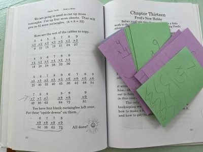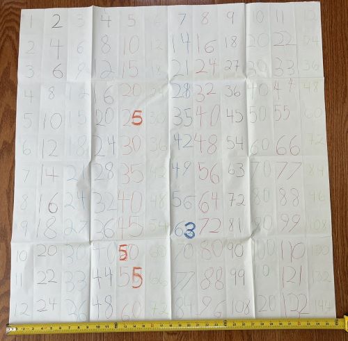The picture below shows a multiplication chart we made when our oldest daughter was doing Math by Hand in 1st grade. This might be the biggest multiplication chart you’ve ever seen – yes, the ruler is in the picture to show it’s 36 inches by 36 inches! This chart hung on wall in our house for many years. What a great way to have a BIG reminder of the multiplication facts! The program came with this very large sheet of paper and directions for how to fold it to make the chart. The child actually fills in all of the numbers with crayon.