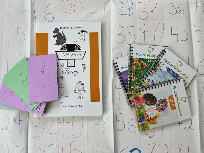 Life of Fred teaches multiplication through the main character, Fred, teaching his students. The program encourages students to create their own multiplication flashcards. Life of Fred makes memorizing the multiplication facts a bit less overwhelming, as it pairs down the facts that actually have to be learned and takes out the repeats (see image below).